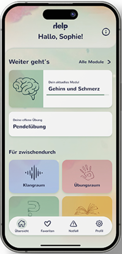 HELP ist eine digitale Anwendung zur Unterstützung von Menschen mit chronischen primären Schmerzen. Sie verbindet moderne Schmerzedukation mit verhaltens- und emotionsbezogenen Übungen, die auf aktuellen neurobiologischen Modellen der Schmerzverarbeitung basieren. In einer empathischen und patientenzentrierten Gestaltung hilft HELP Betroffenen, ihre Symptome besser zu verstehen, neue sichere Erfahrungen im Umgang mit ihrem Schmerz zu machen und so zu einer spürbaren Reduktion der Schmerzbelastung sowie zu mehr Lebensqualität zu gelangen.