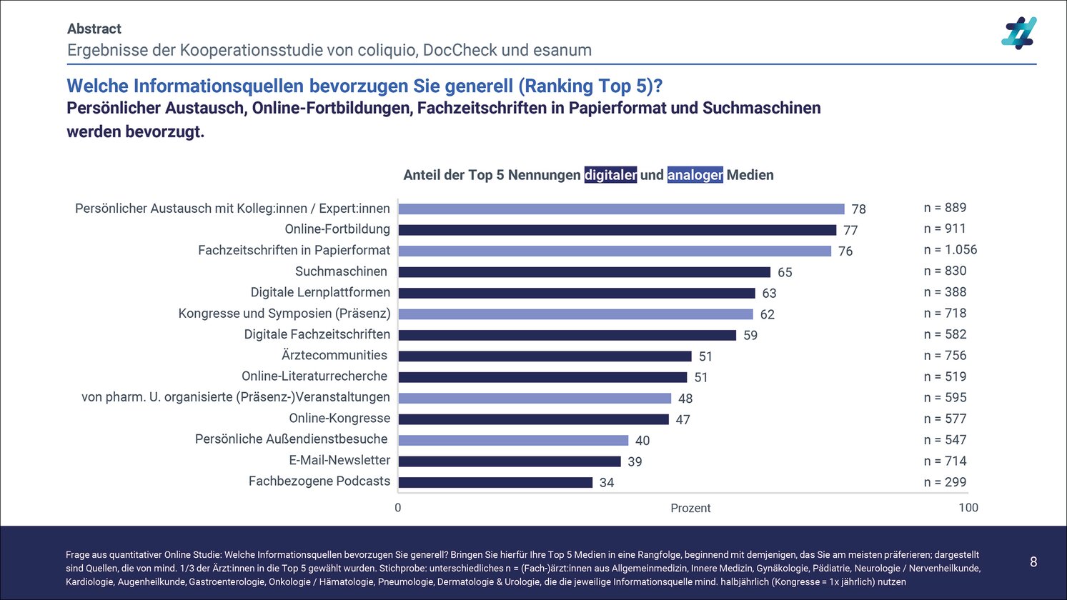 Ärzte sind zur Informationsbeschaffung zunehmend in digitalen Räumen unterwegs. Doch wie genau nutzen Ärzte Online-Medien und welche Informationsquellen spielen dabei eine Rolle? Aus dem gemeinsamen Interesse am digitalen Nutzungsverhalten und Online-Medienkonsum deutschsprachiger Ärzte heraus haben die Ärztenetzwerke coliquio, DocCheck und esanum die Forschungsgemeinschaft ARI (Activity – Reachability – Interaction) geschaffen, die die neue Mediennutzungsstudie durchgeführt hat.