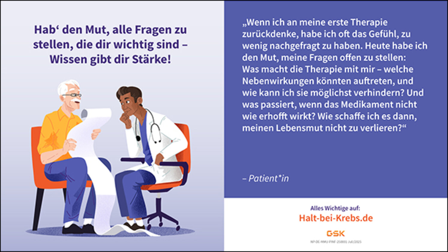 Um Patienten und ihre Angehörigen – insbesondere in Phasen eines Rückfalls – Informationen und positive Anregungen für den Alltag zu bieten, hat GSK die Initiative "ZURÜCK ZU DIR" entwickelt. Ziel der Initiative ist es, Betroffene darin zu unterstützen, Schritt für Schritt zurück zu sich selbst zu finden. Sie umfasst ein Kartenset bestehend aus 20 Karten, die einfache Tipps und praktische Anregungen von Patienten, Ärzten und Psycho-Onkologen enthalten. Dabei werden Themen wie "Selbstermächtigung", "Resilienz", "Sport und Bewegung" sowie