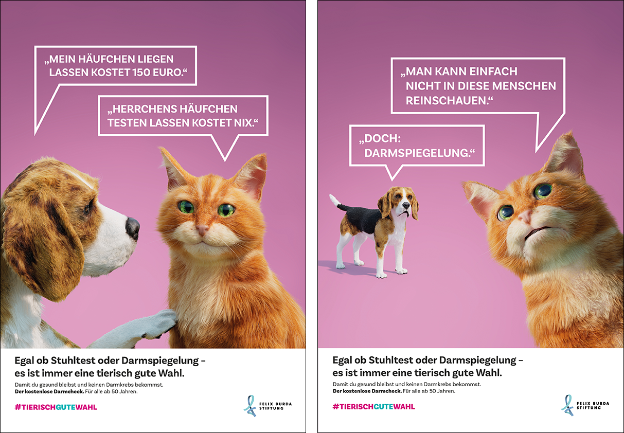 „Wir freuen uns, dass wir ein so wichtiges Thema seit 2020 für die Felix Burda Stiftung kreativ begleiten dürfen“, unterstreicht Creative Director Matthias Jester-Pfadt von Serviceplan Health & Life das Engagement der Agentur. „Wir haben dazu eine Kampagne entwickelt, die aus einer neuen Perspektive Awareness für das Thema Darmkrebsprävention schafft. Die Kampagne #TierischGuteWahl wird im Darmkrebsmonat März 2024 als TVC, Digital-out-of-Home, Radio, Online, Social Media und als Print-Anzeigen erscheinen und wir hoffen, dass sie noch mehr Menschen zur Vorsorge motiviert.“ Katze und Hund werben in vier Motiven mit unterschiedlichen Dialogen für den Darmcheck.