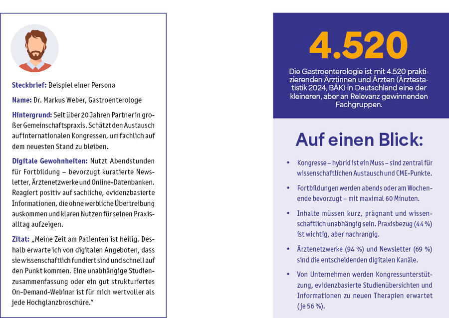 Die Gastroenterologie ist eine digital überdurchschnittlich affine und zugleich wissenschaftlich anspruchsvolle Zielgruppe. Effizienz und Kredibilität sind die zwei wichtigsten Faktoren: Priorisiert werden Inhalte, die kompakt, evidenzbasiert und wissenschaftlich unabhängig sind (Facharztreport 2025). Besonders geschätzt werden Formate wie Studienzusammenfassungen, Kongressberichte und therapiebezogene Fachinformationen – idealerweise mit hoher Aktualität und fachlicher Tiefe.