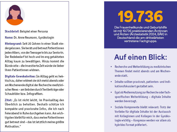 Gynäkologinnen und Gynäkologen verlagern Weiterbildung oft in ihre Freizeit und sind am liebsten digital unterwegs. Natürlich sind fachspezifische Themen für sie von Interesse, aber auch Forschung und Entwicklung sowie Digitale Gesundheitsanwendung (DiGA) finden Anklang. Relevant sind Praxisnähe und direkte Anwendbarkeit der Inhalte (56 %). In Bezug auf Kongresse sollte es hybrid sein: Digitale Elemente ermöglichen eine flexible Teilnahme, Elemente in Präsenz fördern das Networking.