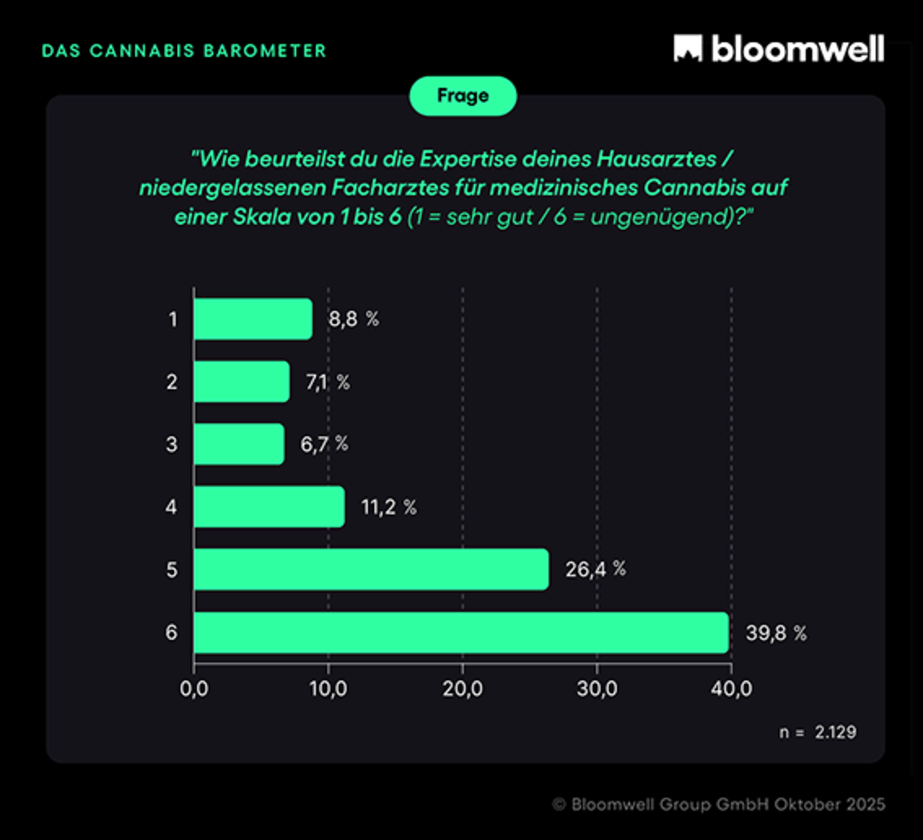 - Von den Patient:innen, die von ihrem niedergelassenen Arzt oder ihrer Ärztin ein Rezept für medizinisches Cannabis erhalten haben, sehen 30 Prozent diesen seltener als einmal im Quartal.