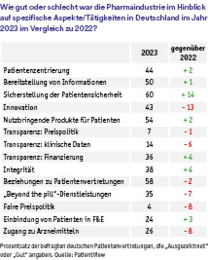 Die Innovationsfähigkeit der Pharmaindustrie wurde ebenfalls kritisch bewertet. Nur 43 % der Befragten stufen die Innovationsfähigkeit der Pharmaindustrie als „ausgezeichnet“ oder „gut“ ein, was einen Rückgang von 13 Prozentpunkten im Vergleich zu 2022 darstellt. Dagegen sehen die 121 befragten deutschen Patientenvertretungen, von denen jeweils rund ein Fünftel den Fachgebieten Seltene Erkrankungen, HIV/AIDS, Krebs sowie Neurologischen Erkrankungen angehören, die Biotechnologiebranche deutlich positiver als Pharma. 64 % bewerten deren Reputation als „ausgezeichnet“ oder „gut“, was auf das schnelle Wachstum der Biotechnologie in Deutschland zurückzuführen sein könnte, wie die Autoren vermuten.
