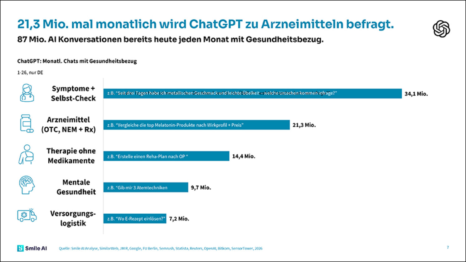 Ein zentrales Ergebnis: In Deutschland haben bereits 87 Mio. monatliche KI-Konversationen einen Gesundheitsbezug – und 21,3 Mio. ChatGPT-Anfragen beziehen sich schon konkret auf Arzneimittel. Gleichzeitig nutzen bereits 20 % der Ärzte KI-Tools für fachliche Recherchen.